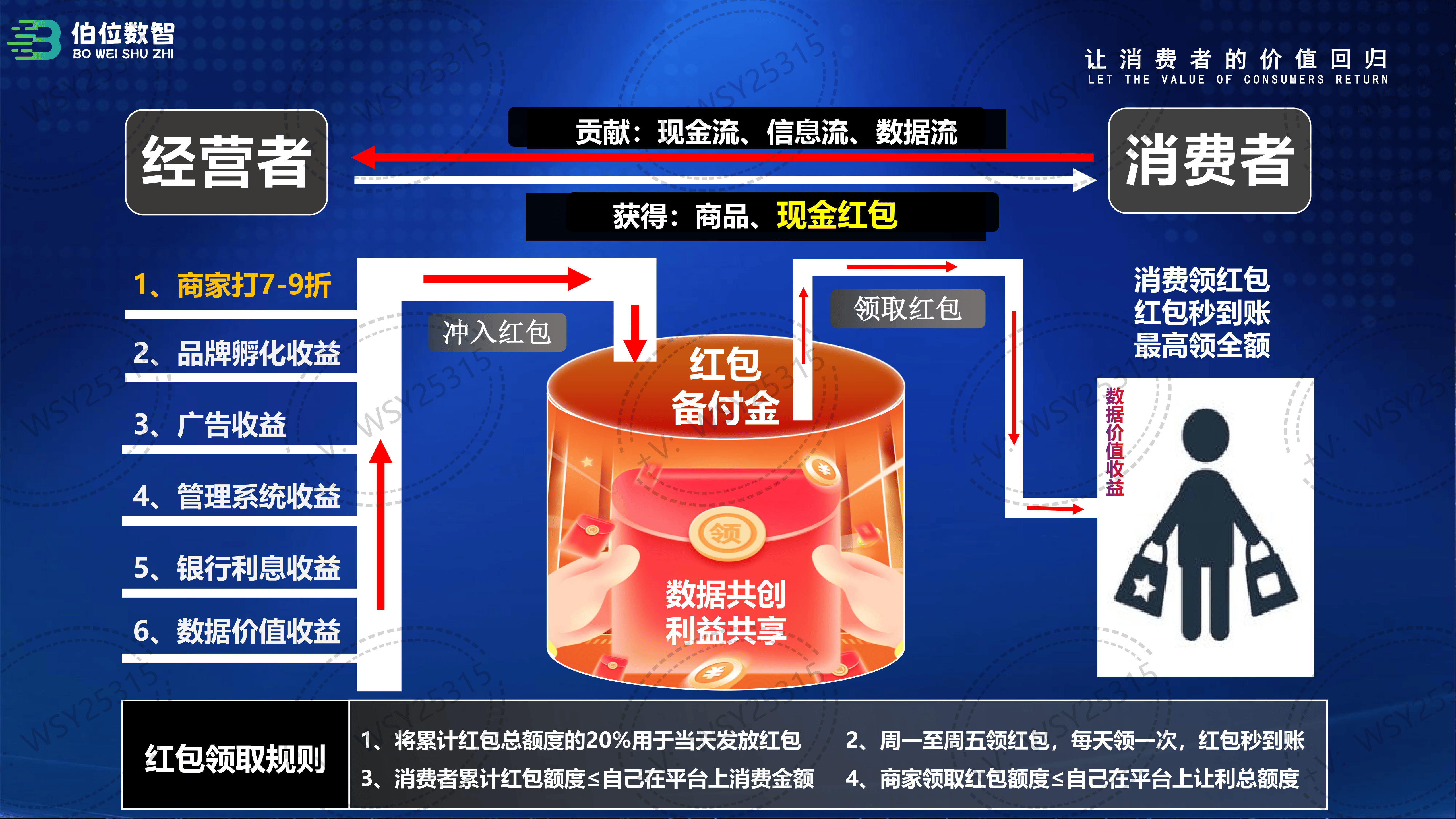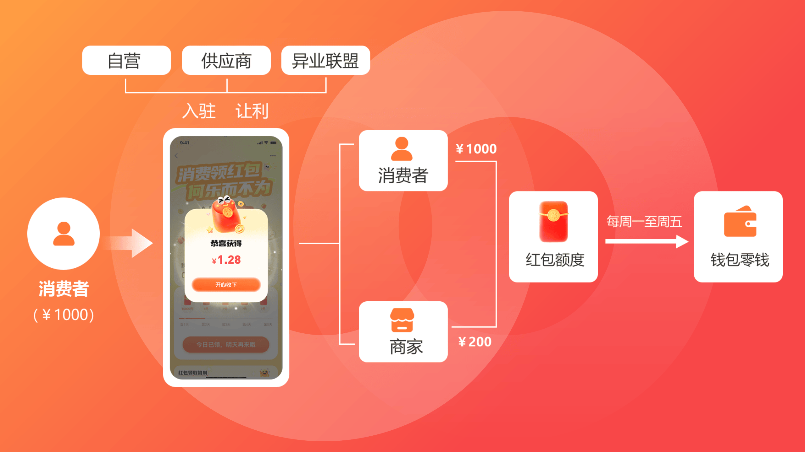 举例:消费者消费100元,商家让利10%,将其中的10元放入红包池,消费者第二天开始领取红包,Zui高可领取与消费金额相等的数额,即100元。