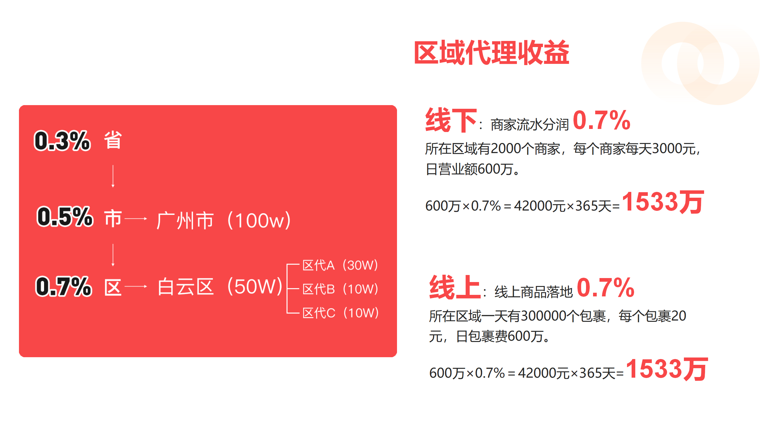 4、区域代/理:区域服务商做好本区域内的商家服务和市场开拓,开拓的商家越多,流水越高,区域代/理人员可以获得更高的收益。区域代/理的收益主要来源于两部分,线上产品落地价格的0.7%流水收益和线下商家流水的0.7%的流水收益,这种分润机制激励着区域代/理人员做好区域内的服务工作。